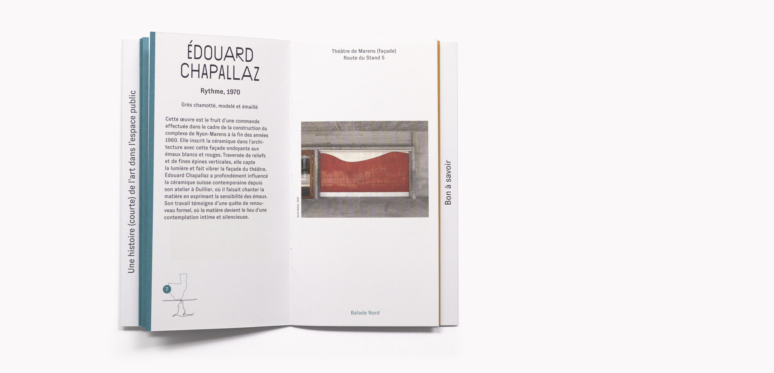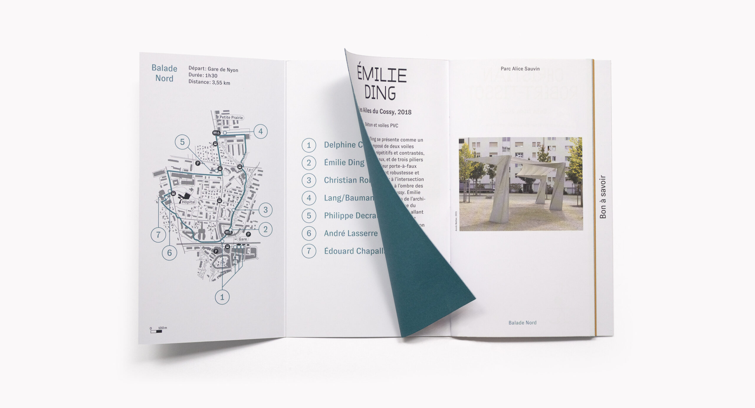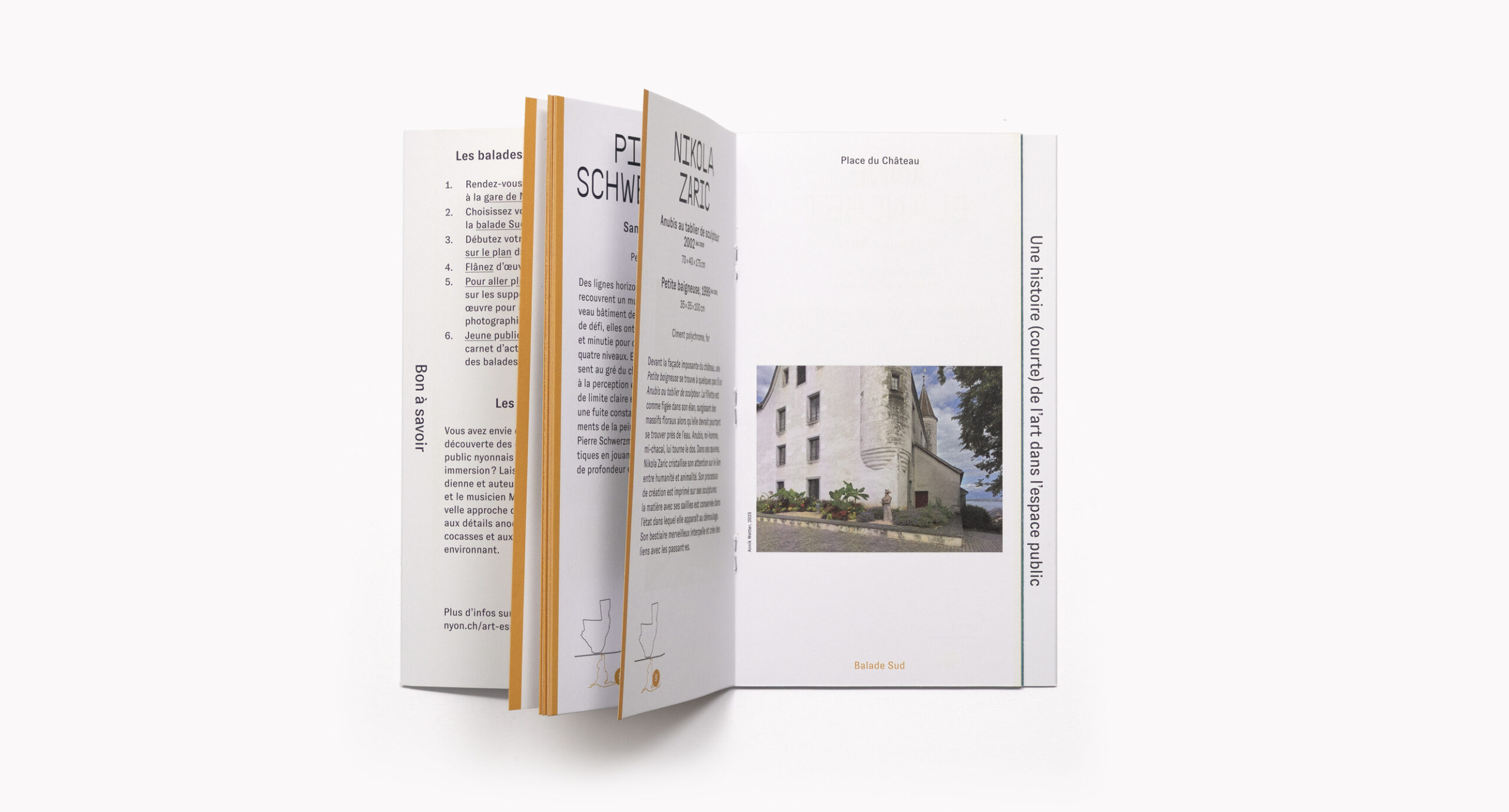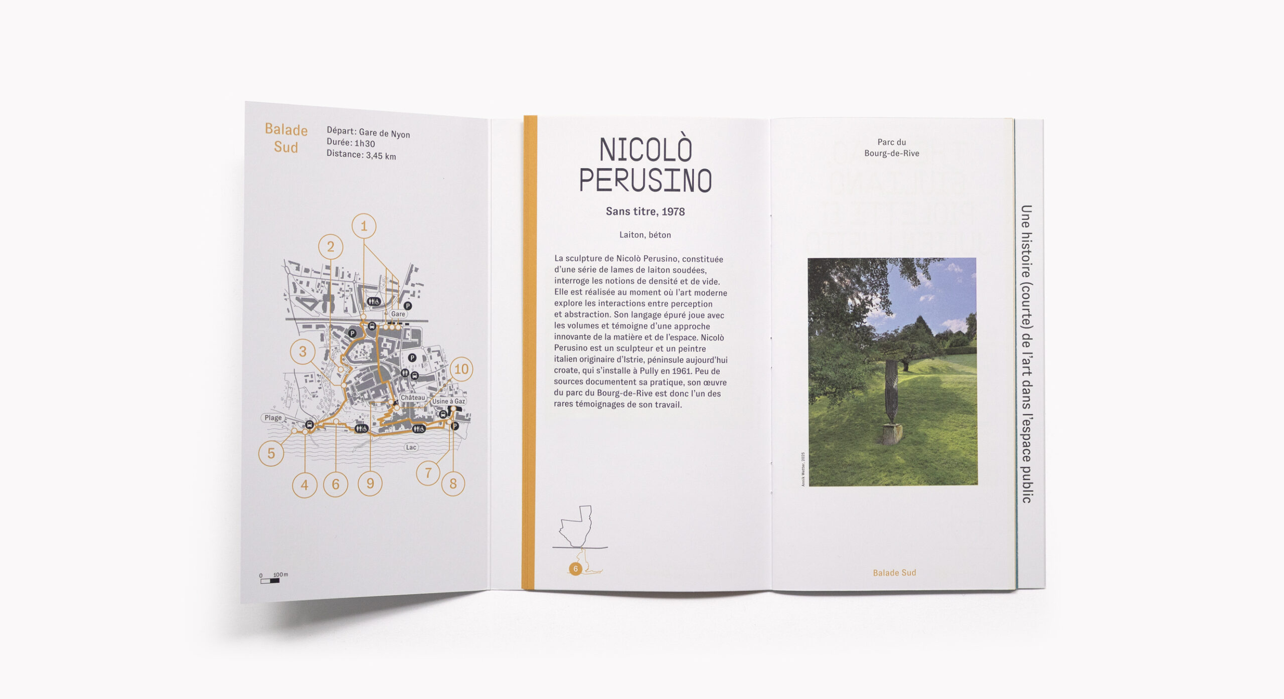 Artistic guide presenting two walks (North/South) in Nyon, and an introduction to the works of art acquired by the city.